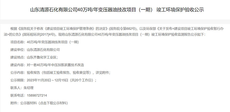 山東清源石化有限公司40萬噸/年變壓器油技改項目(一期)竣工環(huán)境保護(hù)驗收公示